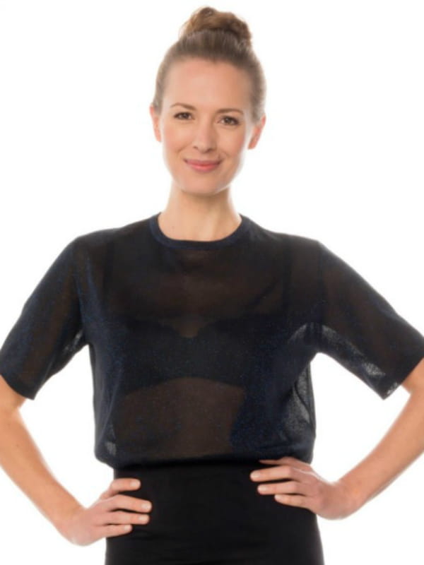 Top ample à col rond et manches courtes bleu nuit en tissu Lurex® légèrement transparent de Maison Lurex