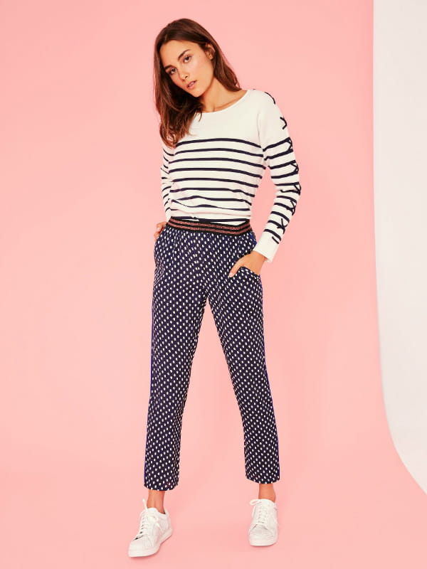 Pantalon carotte bleu marine à pois blancs avec élastique à la taille de Suncoo