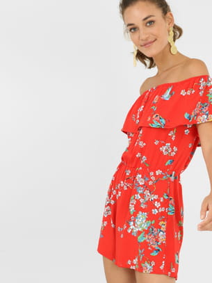 Combinaison short rouge à fleurs encolure Bardot de Pimkie