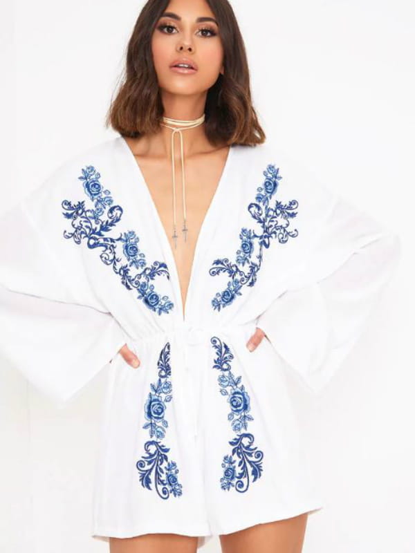 Combinaison short blanc décolleté plongeant avec motifs bleus de PrettyLittleThing