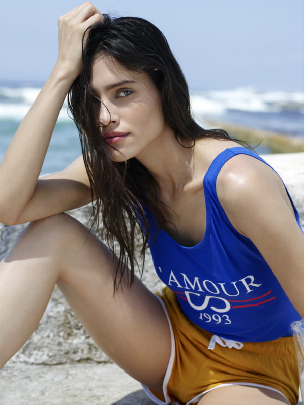 Maillot de bain une-pièce bleu avec inscriptions blanches et rouges de Primark