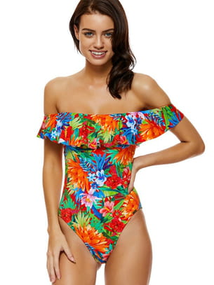 Maillot de bain une-pièce bandeau rouge à volant et imprimé fleurs tropicales de Banana Moon
