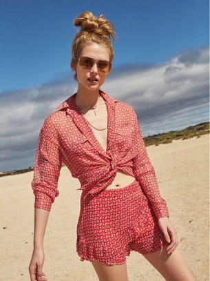 Short vaporeux rouge en soie imprimé de petites fleurs de The Kooples