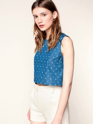 Crop top effet denim à imprimé ancres boutonné dans le dos de Louche chez Monshowroom