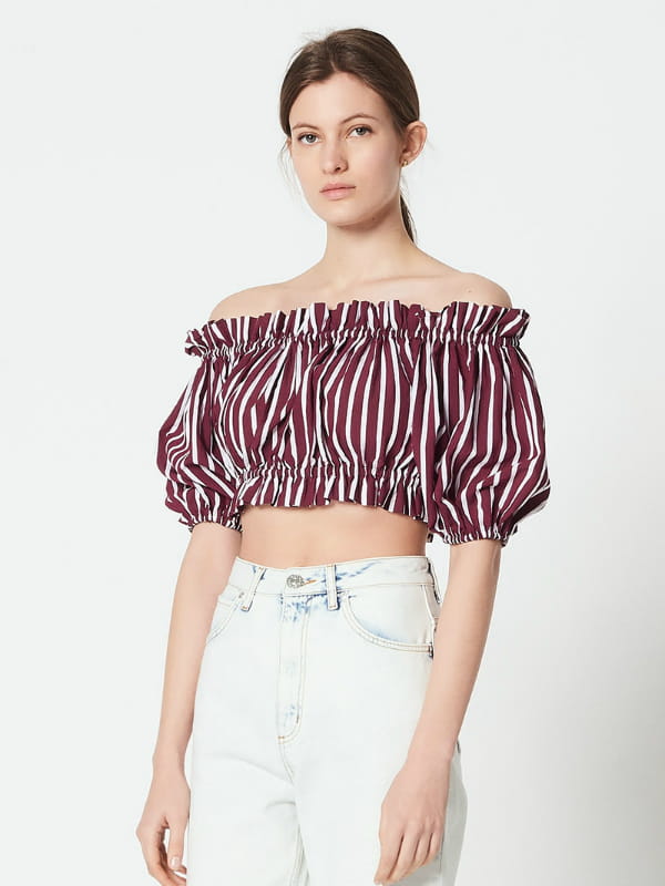 Crop top bordeaux et blanc à rayures légèrement bouffant de Sandro