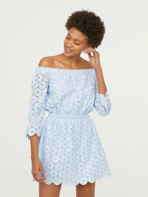 Robe courte en broderie bleu clair à encolure Bardot de H&M