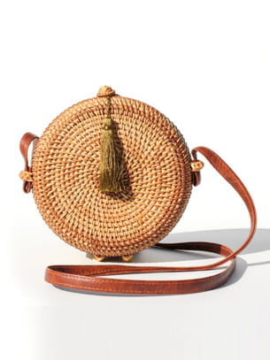 Petit sac panier rond en rotin tressé avec pompon kaki fait main au Vietnam de La Mochila