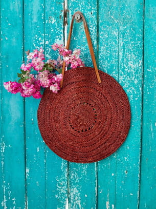 Sac panier rond en raphia couleur terre avec anses en cuir de Sézane