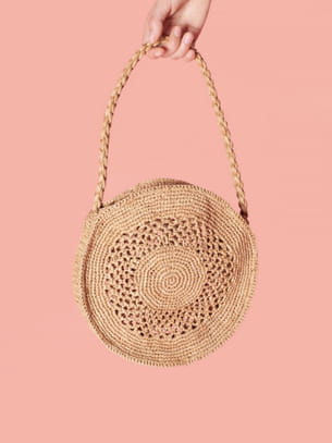 Petit sac panier rond porté épaule en raphia tressé fait main à Madagascar de Rouje