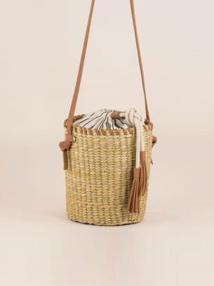 Sac panier cylindrique en jonc tressé fabriqué artisanalement avec rabat en tissu et anse en cuir de Sessùn