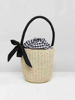 Petit sac panier cylindrique en paille tressée avec anse et nœud noirs et empiècement à carreaux vichy noirs et blancs de Asos Design