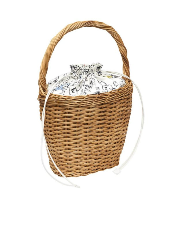 Petit sac panier cylindrique tressé avec tissu blanc imprimé sur le dessus d'Edie Parker
