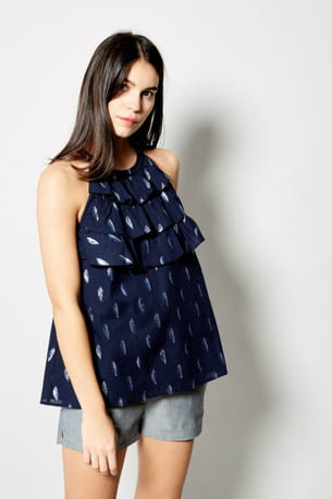 Top bleu marine à volants imprimé de petites plumes irisées de Karl Marc John