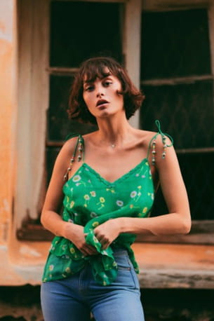 Caraco vert en soie à imprimé floral aux bretelles parées de perles de The Kooples