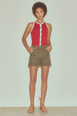 Top rouge à liseré blanc boutonné sur le devant de Vanessa Seward