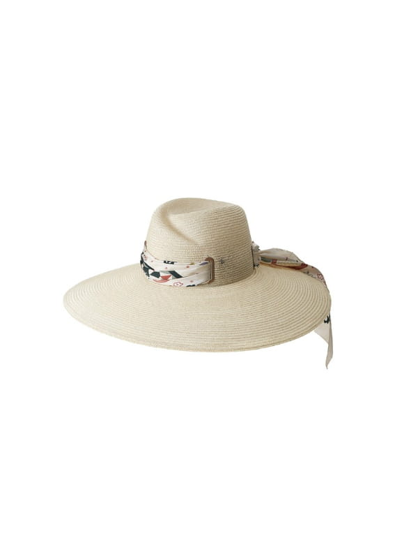 Chapeau en paille naturelle paré d'un foulard en soie à imprimé estival de Maison Michel