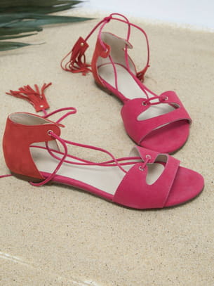 Nu-pieds en daim rouge et rose à pompons de IKKS