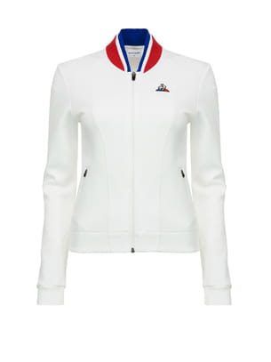 Sweat cintré et zippé en coton blanc avec logo coq sur le côté et col montant  bleu/blanc/rouge