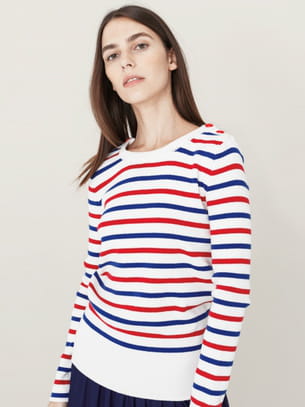 Marinière longue en coton cachemire blanc avec rayures bleu marine et rouges et boutons rouges aux épaules du Mont St Michel
