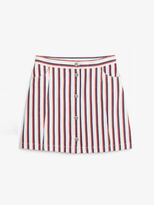 Jupe courte en coton rayé bleu/blanc/rouge boutonnée sur le devant de Monki