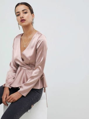 Top cache-cœur manches longues en satin rose poudré de Asos