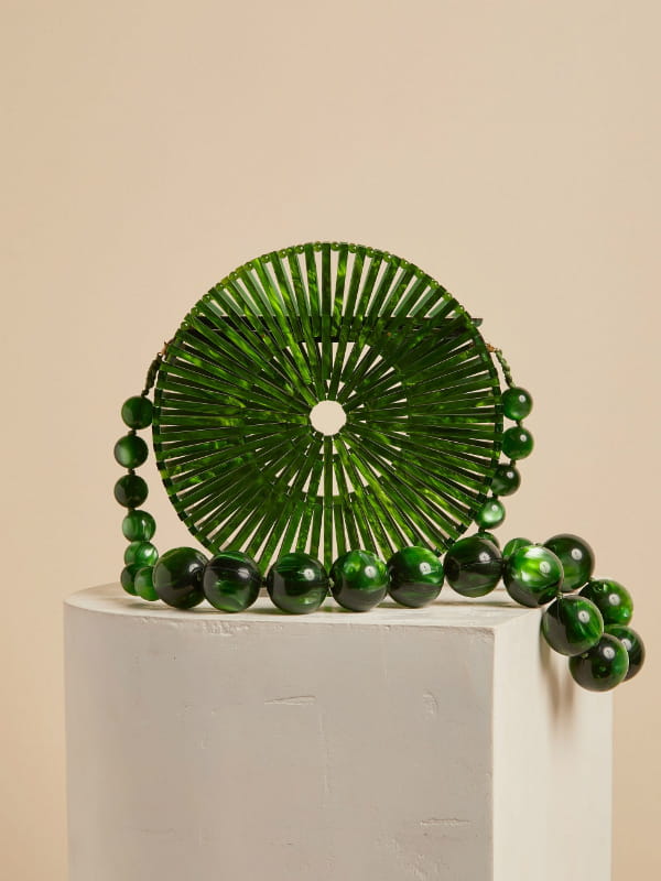 Sac rigide rond ajouré vert avec bandoulière porté épaule en grosses perles vertes de Cult Gaia