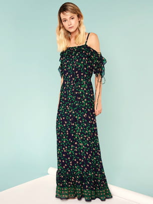 Robe longue épaules dénudées à imprimé fleuri bleu nuit, vert et rose pâle de Suncoo