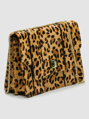 Sac rectangulaire rigide poils imprimé léopard avec bandoulière porté épaule en chaîne dorée de Cosmoparis