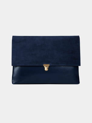 Sac double pochette en cuir lisse et daim bleu nuit avec bandoulière porté épaule de Léo et Violette
