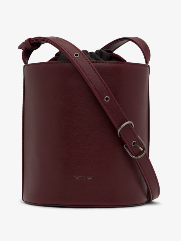 Sac cylindrique en cuir bordeaux avec fermeture coulissante et bandoulière porté épaule de Matt & Nat