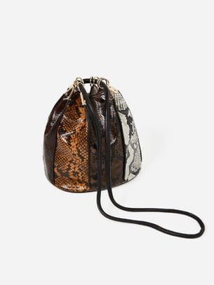 Grand sac bourse en patchwork façon peau de serpent et bandoulière porté épaule de Uterqüe