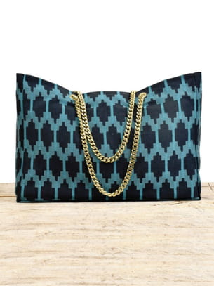 Sac grand format en tissu d'ameublement jacquard bleu marine et turquoise avec anses en chaîne laiton brut de Marli