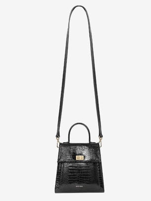 Sac trapèze rigide en cuir noir façon croco avec fermoir doré, anse porté main et bandoulière porté épaule de Anine Bing