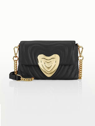 Sac rectangulaire en cuir matelassé noir avec fermoir cœur doré et bandoulière chaîne dorée et cuir porté épaule d'Escada
