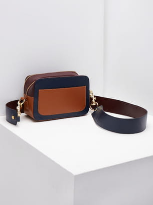 Petit sac besace rectangulaire rigide tricolore bleu marine, bordeaux et camel avec bandoulière porté épaule d'Un Jour Ailleurs