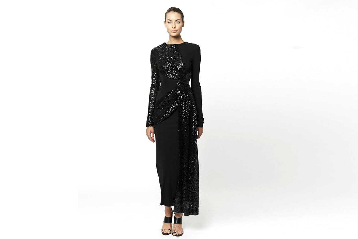 Robe noire longue avec drapé sequins de Prabal Gurung