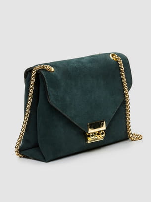 Petit sac à main en cuir vert sapin avec bandoulière chaîne porté épaule et fermoir dorés de Cosmoparis