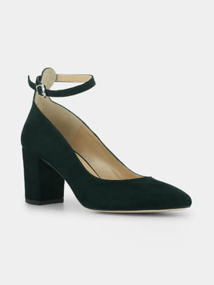 Ballerines en velours vert sapin à  petit talon carré et bride cheville de Jonak 95 euros