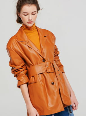 Veste oversize couleur camel en simili cuir et sa ceinture à boucle carrée de Storets