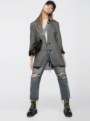 Veste droite grise en laine mélangée avec fente dans le dos créant un jeu de superposition grâce à la transparence de son tissu intérieur noir de Diesel