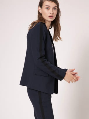 Veste bleu marine avec bandes noires verticales sur les manches sans col et sans fermeture avec poches à rabat sur le devant de Zapa