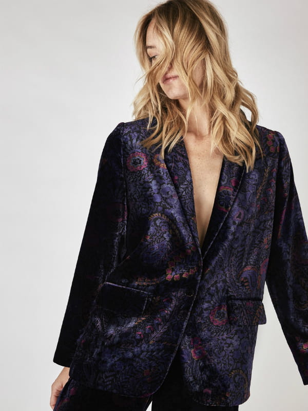 Veste oversize en velours imprimée prune à boutonnage unique et poches à rabat sur le devant de Berenice