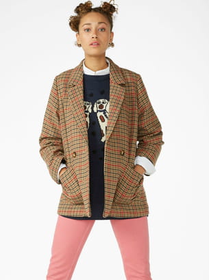Veste droite à carreaux beiges et rouges à double boutonnage croisé façon corne et poches plaquées sur le devant de Monki