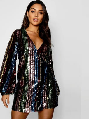 Robe courte à manches longues ballon et rayures sequins multicolores de Boohoo