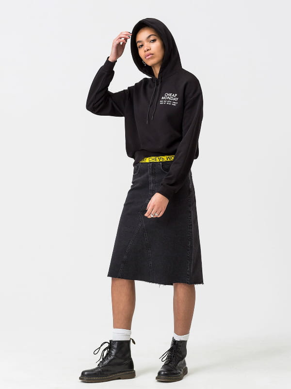 Jupe noire en jean coupe midi avec un élastique à la taille griffé de Cheap Monday
