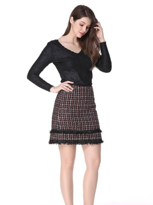 Mini-jupe noire et rouge façon tweed à motif pied-de-poule avec franges sur le bas de Jus d'Orange