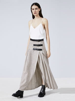 Longue jupe plissée à petits carreaux écrus croisée et fermée par des brides en cuir de Margaux Lonnberg