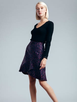 Jupe mi-longue asymétrique volantée en brocart noir, rouge et violet de Sinéquanone
