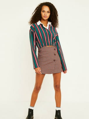 Mini-jupe à micros carreaux couleur moka et boutons bombés en simili cuir d'Urban Outfitters