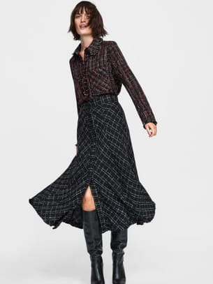 Jupe mi-longue évasée façon tweed à carreaux noirs et blancs fermée par de multiples boutons sur le devant de Zara